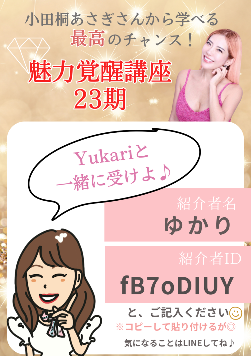 改めまして、、小田桐あさぎ(宮本あさぎ)さん主宰の魅力覚醒講座を19期で受講した、ゆかりです。